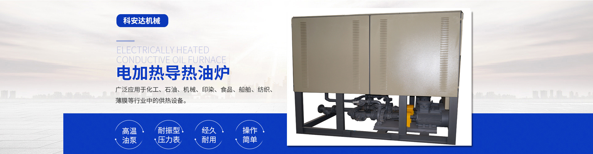 近年來我公司在延用自己的技術基礎上不斷引進先進技術與管理經(jīng)驗,專業(yè)研發(fā)制造電加熱導熱油爐(有機熱載體爐)、電磁感應加熱器、電加熱爐、熱風循環(huán)箱式預熱爐、風道加熱器、空氣加熱罐、電加熱管、高溫電阻爐、保溫烘箱、烘道、鑄鋁鑄銅加熱器、防爆加熱器、遠紅外加熱管、埋入式遠紅外陶瓷加熱瓦、陶瓷加熱圈、不銹鋼云母電熱圈、碳化硅遠紅外電加熱板、電熱帶 、真空清洗爐、三甘醇清洗爐等。產(chǎn)品適用于化纖、紡織、皮革、塑料機械、電纜機械、食品機械、橡膠機械、冶金、石油、化工、電子、醫(yī)療、海洋工程、家用電器等行業(yè)。同時可根據(jù)客戶使用與現(xiàn)場安裝的需要,設計、制造特殊規(guī)格的上述設備,企業(yè)以其先進技術、合理的價格,周道的服務使產(chǎn)品遠銷國內(nèi)外。